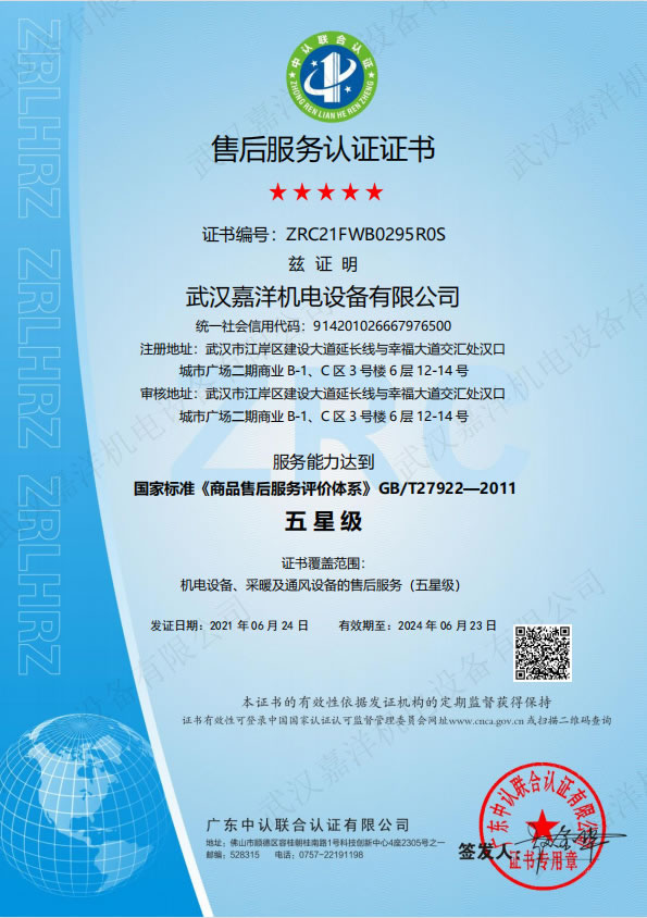 近日,嘉洋機電通過國家權(quán)威機構(gòu)專業(yè)評審,榮獲售后服務認證五星級證書,證書覆蓋范圍包括“機電設備、采暖及通風設備的售后服務(五星級)”